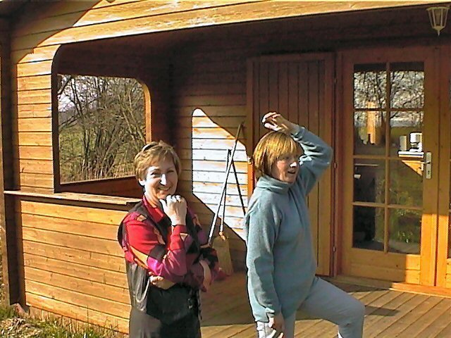 Jutta und Gabi vor Jutta's Hütte bei Rostock